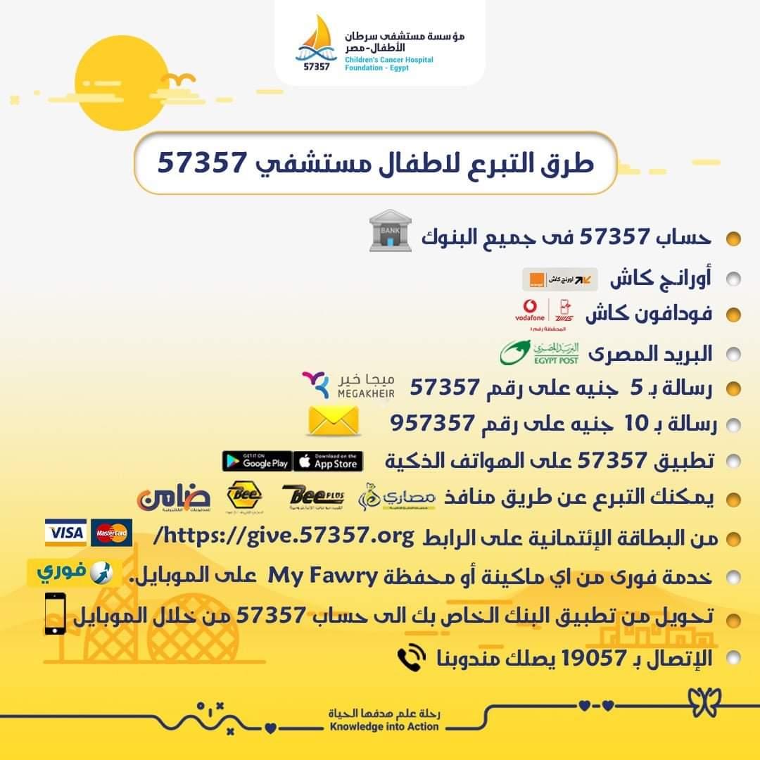 ويمكن التبرع لمستشفى 57357 عبر الحسابات البنكية أو وسائل الدفع الالكتروني أو عبر إرسال رسالة بـ 5 جنيهات إلى الرقم 57357 أو بـ 10 جنيهات إلى الرقم 957357.