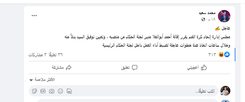 وكتب الإعلامي محمد سعيد عبر صفحته الرسمية على فيس بوك: «مجلس إدارة إتحاد كرة القدم يقرر إقالة أحمد أبوالعلا مدير لجنة الحكام من منصبه ، وتعيين توفيق السيد بدلاً منه، وخلال ساعات اتخاذ عدة خطوات عاجلة لضبط أداء العمل داخل لجنة الحكام الرئيسية».