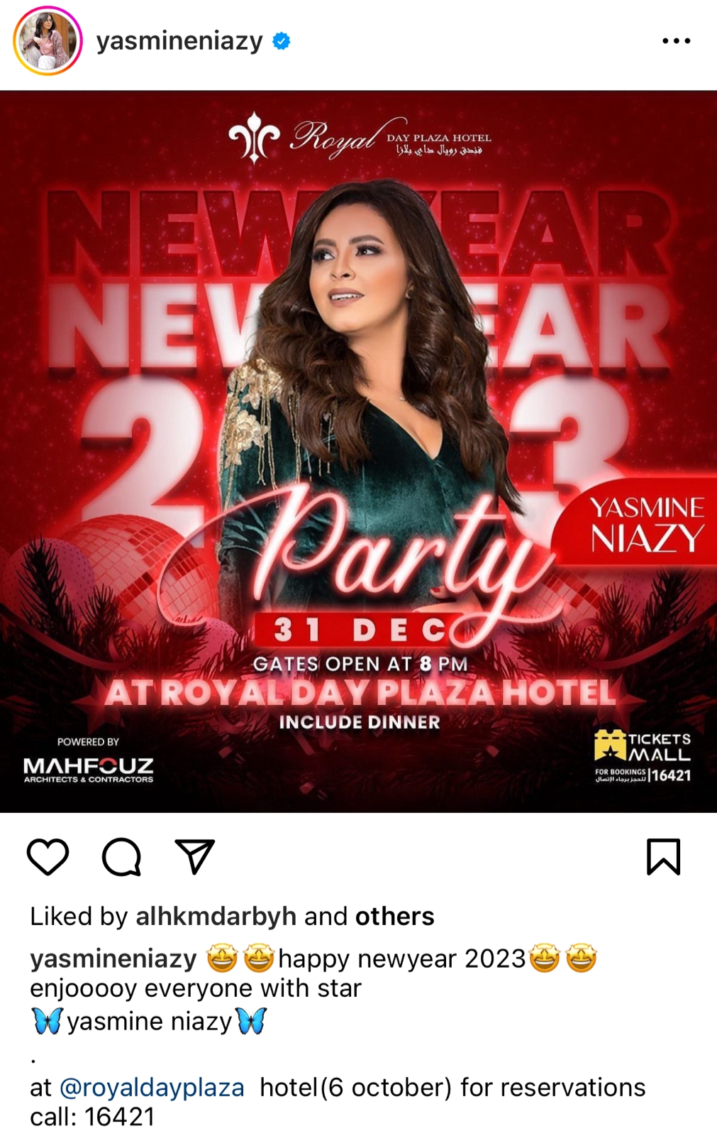 على أن يكون الحفل يوم ٣١ ديسبمر، في فندق رويال داي بلازا بمنطقة 6 أكتوبر، وتفتح الأبواب في تمام الساعة الثامنة مساءًا.