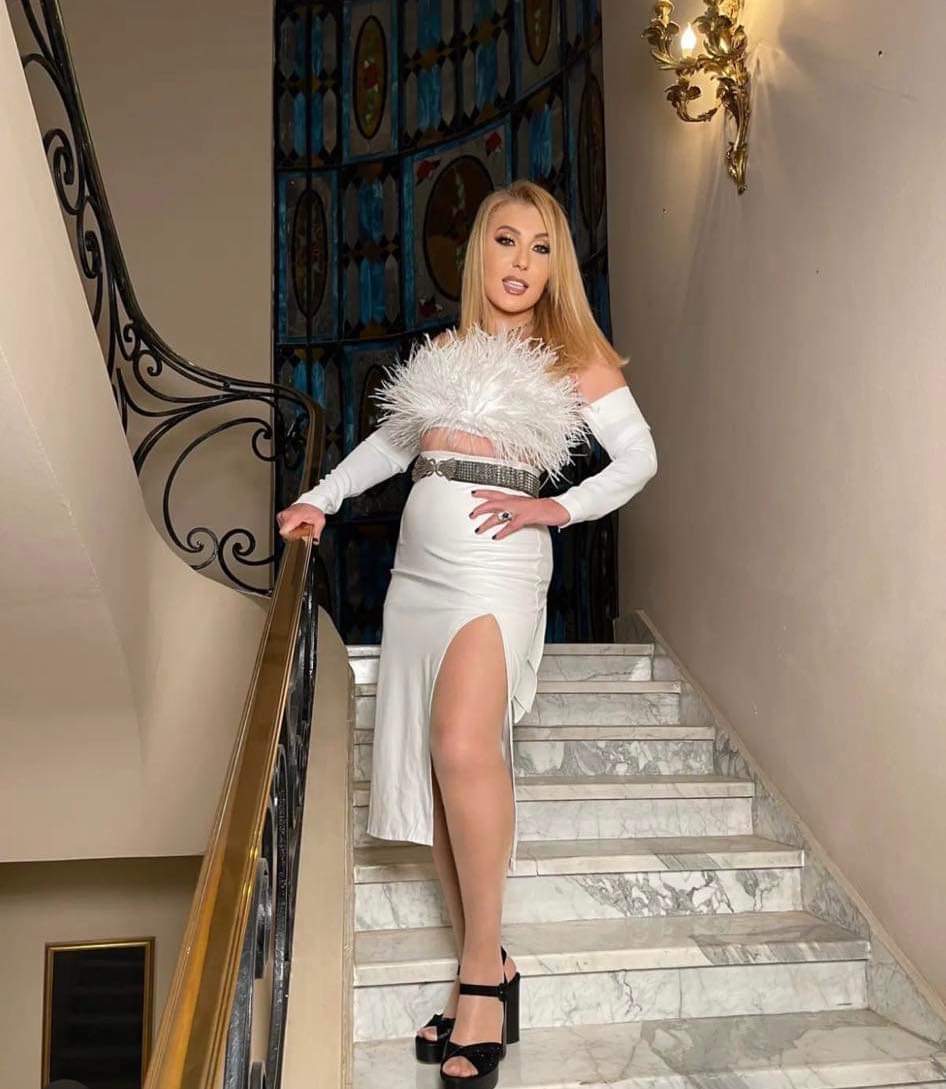 ونشرت نادية الجندي صورة لها بإطلالة مثيرة، ارتدت فيها جيبة بيضاء مفتوحة من منطقة الساق، مع توب بريش أبيض.
