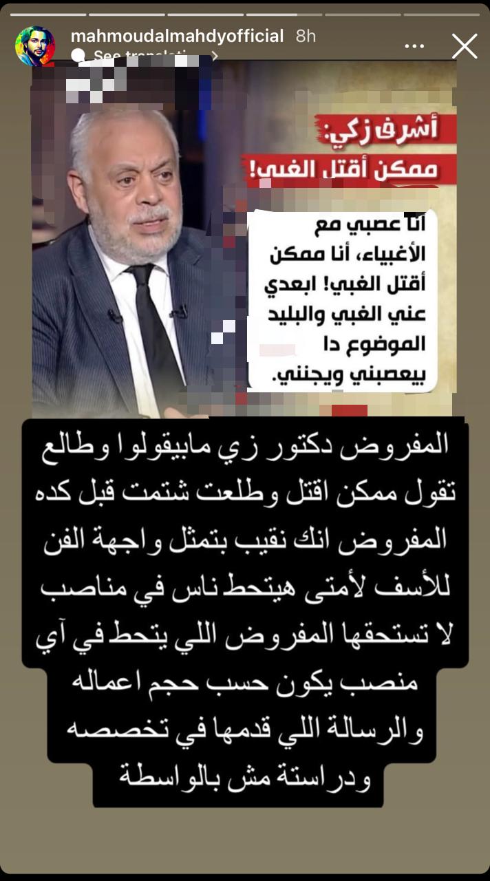 وكتب المهدي عبر ستوري بانستجرام: المفروض دكتور زي ما بيقولوا وطالع تقول ممكن اقتل، وشتمت قبل كده، المفروض انك نقيب بتمثل واجهة الفن.
