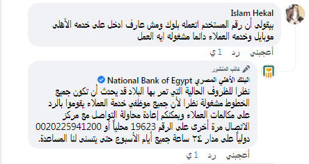رد موظف البنك الاهلى المصرى على شكوى العميل قائلاً: "نظرا للظروف الحالية التي تمر بها البلاد قد يحدث أن تكون جميع الخطوط مشغولة نظرا لأن جميع موظفي خدمة العملاء يقوموا بالرد على مكالمات العملاء".