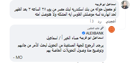 وعلق عميل بنك الاسكندرية في تعليق عبر صفحته الرسمية على موقع "فيسبوك"،: "لو معمول حوالة من بنك الاسكندرية لبنك مصر من يوم ٢٨ الساعه ٢ بعد الظهر لحد انهارده لسه موصلش الفلوس إيه المشكلة ولا هتوصل امتى".