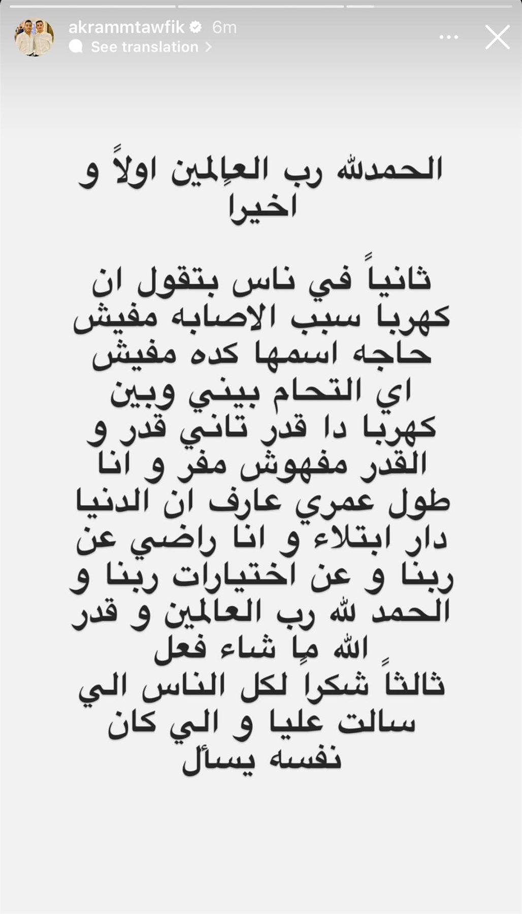 وكتب أكرم توفيق عبر حسابه الرسمي على انستجرام: «الحمد لله رب العالمين أولًا وأخيرًا، ثانيا في ناس بتقول أن كهربا سبب الإصابة مفيش حاجة اسمها كده، مفيش أي التحام بيني وبين كهربا، ده قدر تاني قدر، والقدر مفيهوش مفر، وأنا عارف طول عمري أن الدنيا دار ابتلاء».