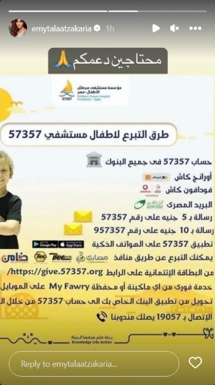 حرصت الفنانة إيمي طلعت زكريا على دعم مستشفى 57357، وحث متابعيها وجمهورها على التبرع لها، وذلك عبر حسابها الرسمي بموقع تبادل الصور والفيديوهات الشهير انستجرام.