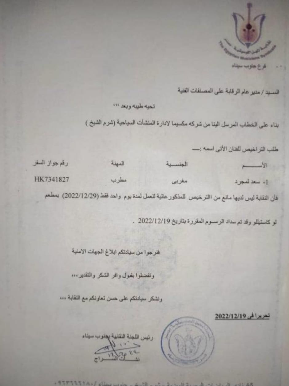 صرحت نقابة المهن الموسيقية للمطرب المغربي سعد لمجرد بالغناء في حفله القادم الذي سيقام في مدينة شرم الشيخ، مؤكدة أن كل ما يثار حوله يدخل في بند الشائعات فلا يوجد أي حكم قضائي عليه.