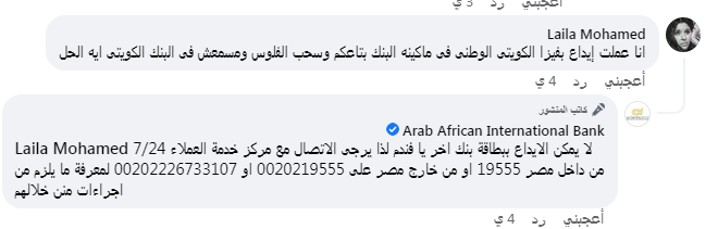 قالت أحدى عملاء البنك العربى الافريقى في تعليق على صفحة المصرف الرسمية على موقع "فيسبوك"،: "أنا عملت إيداع بفيزا الكويتى الوطنى فى ماكينه البنك بتاعكم وسحب الفلوس ومسمعش فى البنك الكويتى إيه الحل".