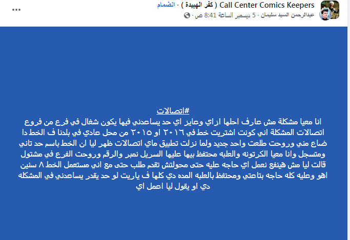 قال أحد عملاء اتصالات مصر في منشور على موقع "فيسبوك"،: "أنا معايا مشكلة مش عارف أحلها إزاي وعايز أي حد يساعدني فيها يكون شغال في فرع من فروع اتصالات المشكلة اني كونت اشتريت خط في ٢٠١٦ او ٢٠١٥ من محل عادي في بلدنا ف الخط دا ضاع مني".