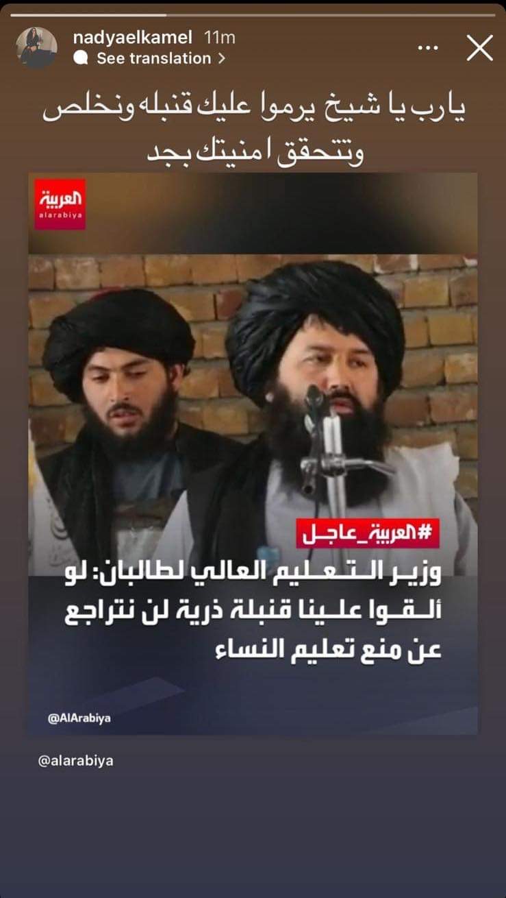 علقت نادية الكامل على تصريحات وزير التعليم العالي بطالبان بشأن تعليم النساء، وذلك عبر حسابها الرسمي بموقع تبادل الصور والفيديوهات انستجرام.