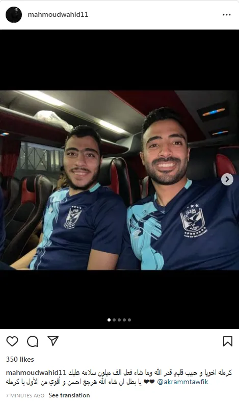 ونشر لاعب فريق طلائع الجيش الحالي، رسالة دعم لـ أكرم توفيق، عبر حسابه الرسمي بموقع التواصل الاجتماعي “ انستجرام”: “ كراملة أخويا وحبيب قلبي، قدر الله ما شاء فعل، وألف مليون سلامة عليك يا بطل”.