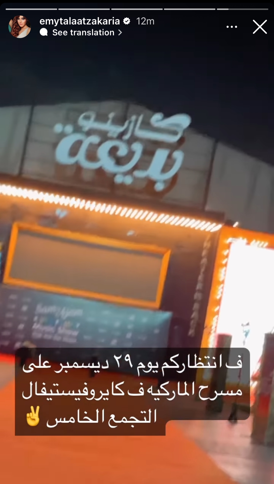 وكتبت إيمي عبر انستجرام: في انتظاركم يوم ٢٩ ديسمبر على مسرح الماركيه في كايروفيستيفال التجمع الخامس.