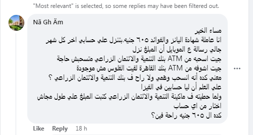 وعلقت: "ولما حطيته ف ماكينة التنمية والائتمان الزراعي كتبت المبلغ علي طول مجاش اختار من أي حساب كده الـ ٦٠٥ جنيه راحة فين؟".