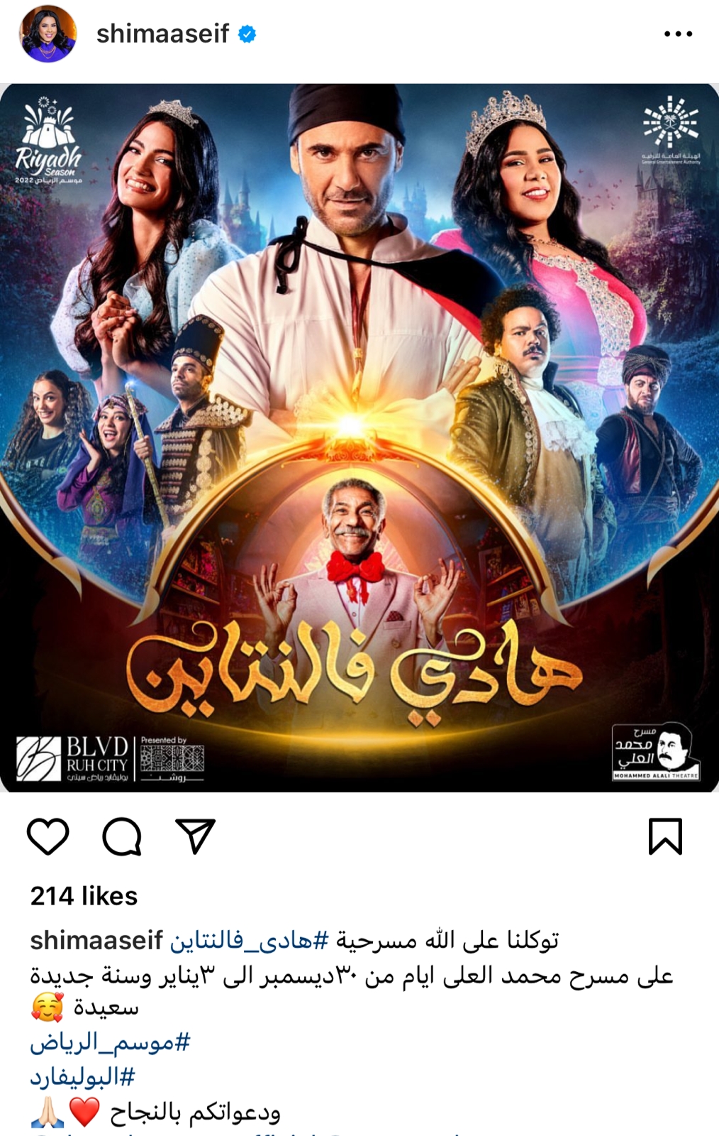 وشاركت شيماء سيف البوستر الرسمي للمسرحية، وعلقت: توكلنا على الله مسرحية هادي فالنتاين على مسرح محمد العلي أيام من ٣٠ ديسمبر إلى ٣ يناير، وسنة جديدة سعيدة.