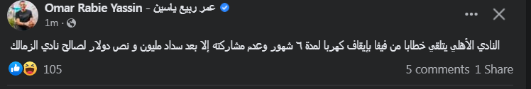 وكتب الإعلامي عمر ربيع ياسين عبر حسابة الرسمي"فيس بوك:" النادي الأهلي يتلقي خطابا من فيفا بإيقاف كهربا لمدة ٦ شهور وعدم مشاركته إلا بعد سداد2 مليون و نص دولار لصالح نادي الزمالك".