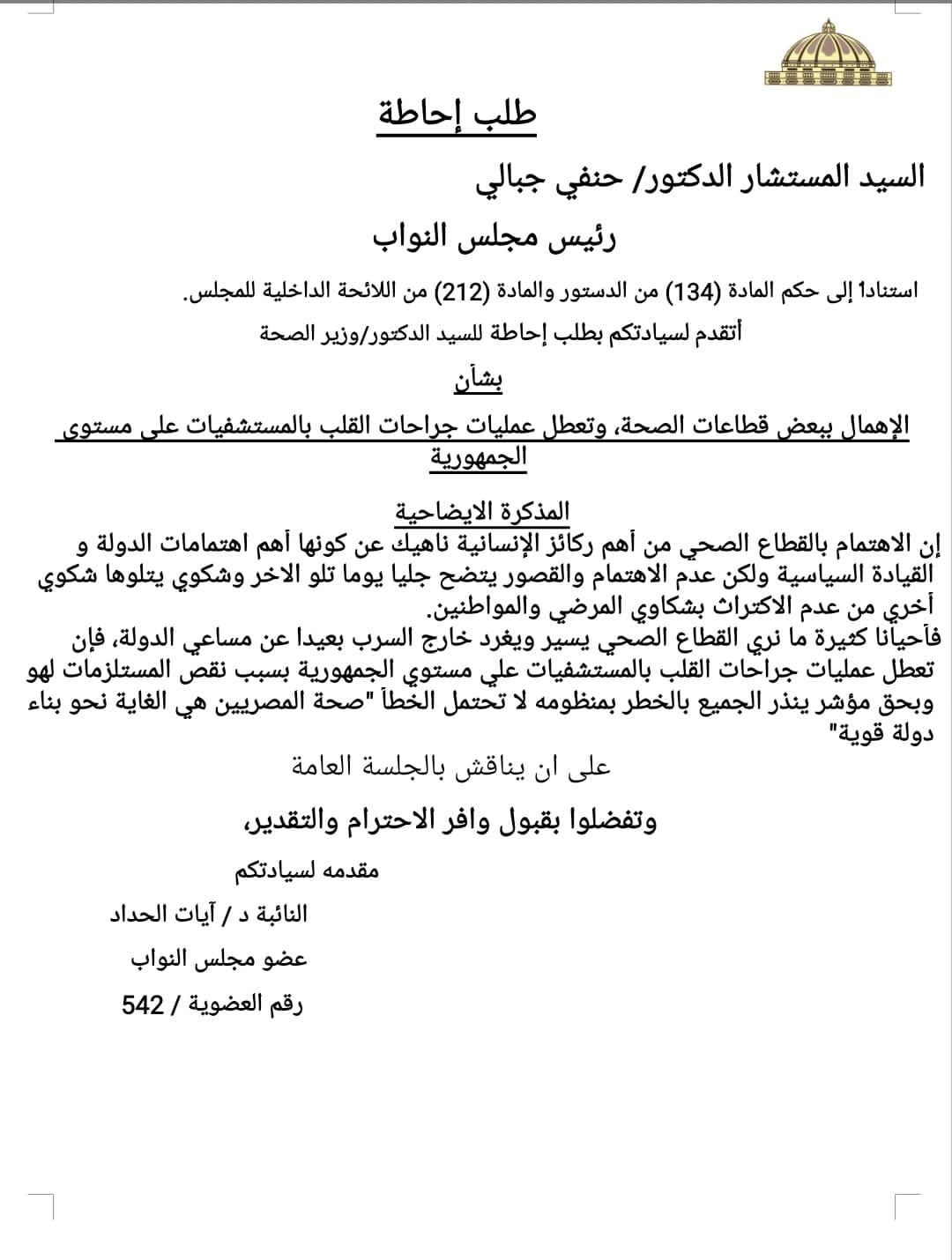 طلب إحاطة للنائبة آيات الحداد بشأن تعطل عمليات جراحات القلب بالمستشفيات