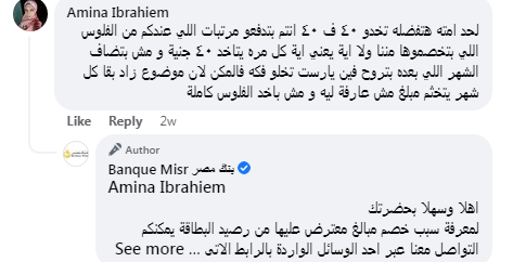 وقالت أحدى عملاء بنك مصر في تعليق على صفحة المصرف الرسمية،: "لحد امتى هتفضله تخدوا ٤٠ فى ٤٠ أنتم بتدفعوا مرتبات اللي عندكم من الفلوس اللي بتخصموها مننا".