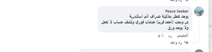 علق أحد عملاء بنك الاسكندرية على صفحة المصرف الرسمية على موقع "فيسبوك"،: "يوجد عطل بماكينة صراف الآلى إسكندريةش ونجت (احمد فريد) خدمات فوري وكشف حساب لا تعمل ولا يوجد ورق".