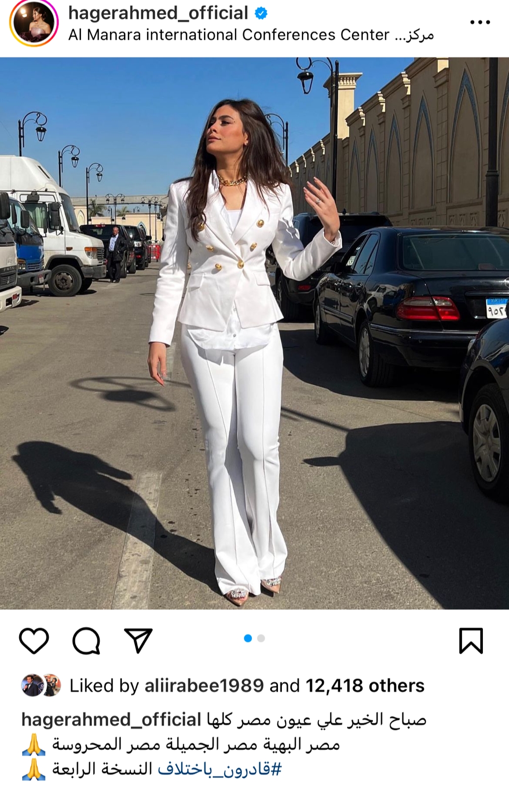 واعتمدت هاجر إطلالة بيضاء تميل للفورمال، وعلقت: صباح الخير على عيون مصر كلها، مصر البهية مصر الجميلة مصر المحروسة النسخة الرابعة من قادرون باختلاف.