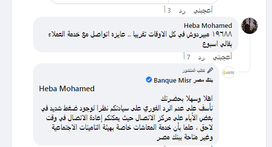 قال أحد عملاء بنك مصر في تعليق على صفحة المصرف الرسمية على موقع "فيسبوك"،: "١٩٦٨٨مبيردوش في كل الأوقات تقريبا .. عايزة اتواصل مع خدمة العملاء بقالي أسبوع".