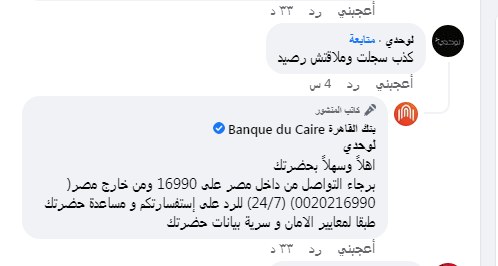 ومن جانبه، قال أحد عملاء بنك القاهرة في تعليق عبر صفحة المصرف الرسمية على موقع "فيسبوك"،: "كذب سجلت وملاقتش رصيد".