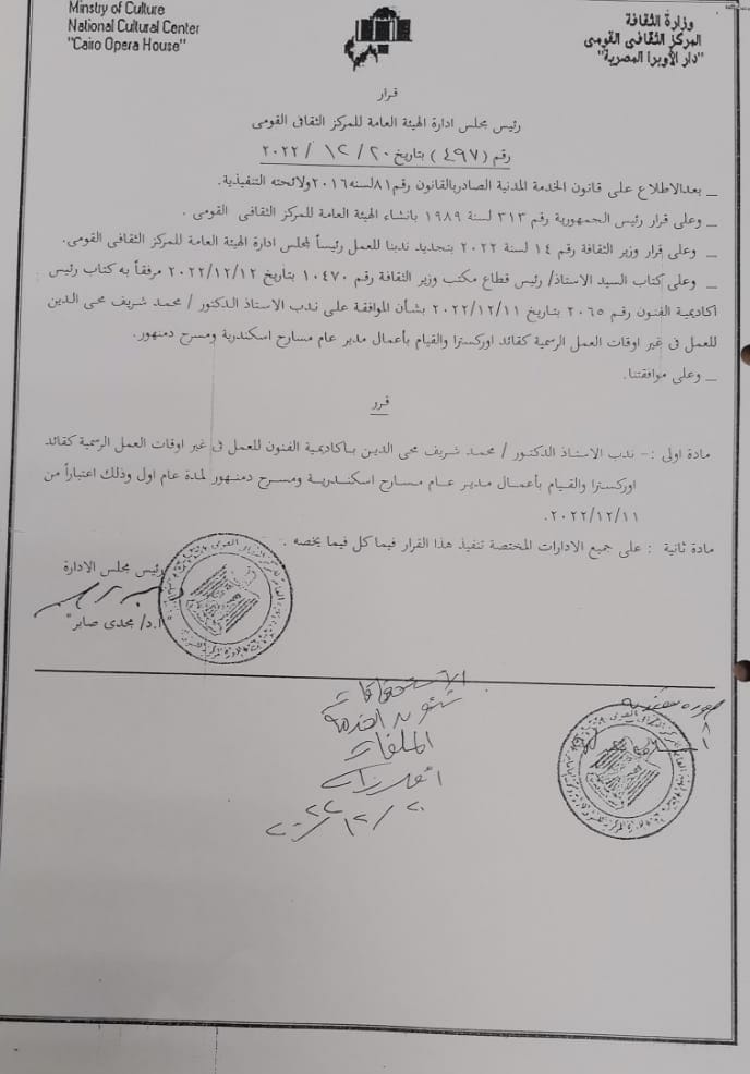 وتابع:" فهو المشرف على معهد الكونسرفتوار في الإسكندرية، ورئيس قسم العلوم الموسيقية في أكاديمية الفنون بالقاهرة، و مدير عام لأوبرا الإسكندرية، و أوبرا دمنهور، وقائد لفرقه اوكسترا اوبرا الاسكندرية، وكل منهما فى محافظة مستقلة".