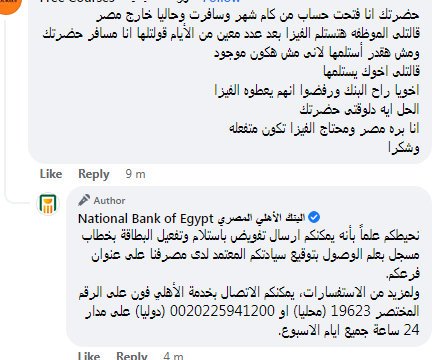 رد موظف البنك الاهلى المصرى بالصفحة قائلا ً: "نحيطكم علماً بأنه يمكنكم ارسال تفويض باستلام وتفعيل البطاقة بخطاب مسجل بعلم الوصول بتوقيع سيادتكم المعتمد لدى مصرفنا على عنوان فرعكم".