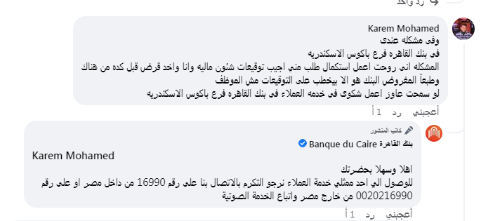 رد موظف بنك القاهرة على العميل قائلاً: " يمكن الوصول إلى أحد ممثلي خدمة العملاء نرجو التكرم بالاتصال بنا على رقم 16990 من داخل مصر او على رقم 0020216990 من خارج مصر واتباع الخدمة الصوتية".
