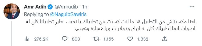 بدأ الهجوم على نجيب ساويرس من قبل عمرو أديب، والذي رد في نفس "التويتة" التي نشرها ساويرس، قائلًا: «احنا مكسبناش من التطبيل قد مانت كسبت من تطبيلك يانجيب. جايز تطبيلنا كان له أصوات إنما تطبيلك كان له ابراج ودولارات وياخساره وعجبي».