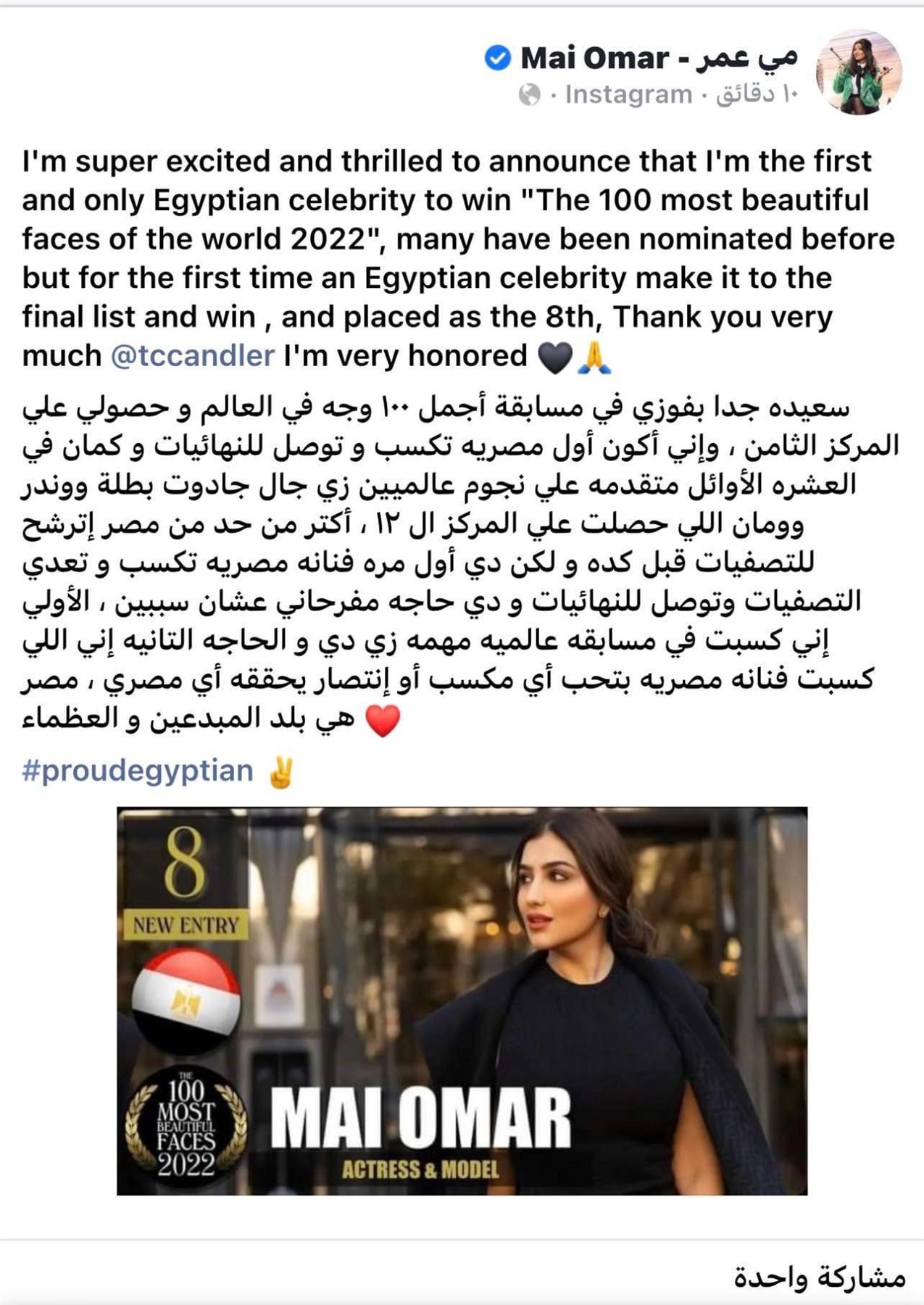 وكتبت مي عمر عبر انستجرام: سعيدة جدًا بفوزي في مسابقة أجمل 100 وجه في العالم و حصولي علي المركز الثامن، وإني أكون أول مصريه تكسب وتوصل للنهائيات.