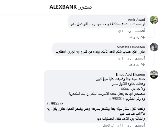 وقال عميل بنك الاسكندرية عبر صفحة المصرف الرسمية على موقع "فيسبوك"،: "خدمة سيئة جدًا وضيعت عليا مبلغ كبير،وعملت شكوه فالكول سنتر ولا حد حل المشكلة".
