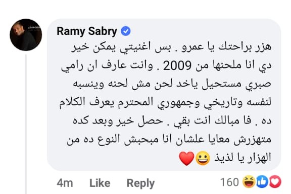 وكتب رامي صبري عبر فيسبوك: هزر براحتك يا عمرو بس أغنيتي يمكن خير دي أنا ملحنها من ٢٠٠٩، وأنت عارف إن رامي صبري مستحيل ياخد لحن مش لحنه وينسبه لنفسه.