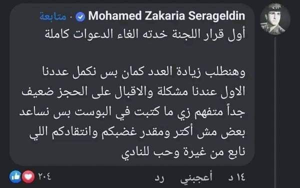 وكتب محمد سراج الدين عبر حسابه الرسمي على «فيس بوك»: «أول قرار اللجنة خدته هو إلغاء الدعوات بشكل كامل، وهنطلب زيادة العدد كمان بس الأول عندنا مشكلة وهي الإقبال على الحجز ضعيف جدًا»، وأضاف محمد سراج الدين: «متفهم جدًا زي ما كتبت في البوست بس نساعد بعض مش أكتر ومقد غضبكم وانتقادكم اللي نابعة من غيرة وحب للنادي».