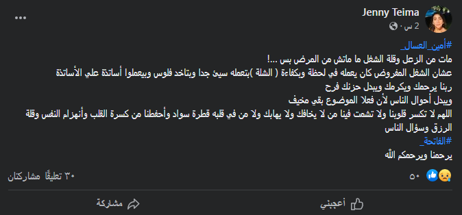 وكتبت جيني طعيمة عبر فيسبوك: مات من الزعل وقلة الشغل ما ماتش من المرض بس، عشان الشغل المفروض كان يعمله في لحظة وبكفاءة “الشلة” بتعمله سيئ جدًا وبتاخد فلوس وبيعملوا أساتذة علي الأساتذة.