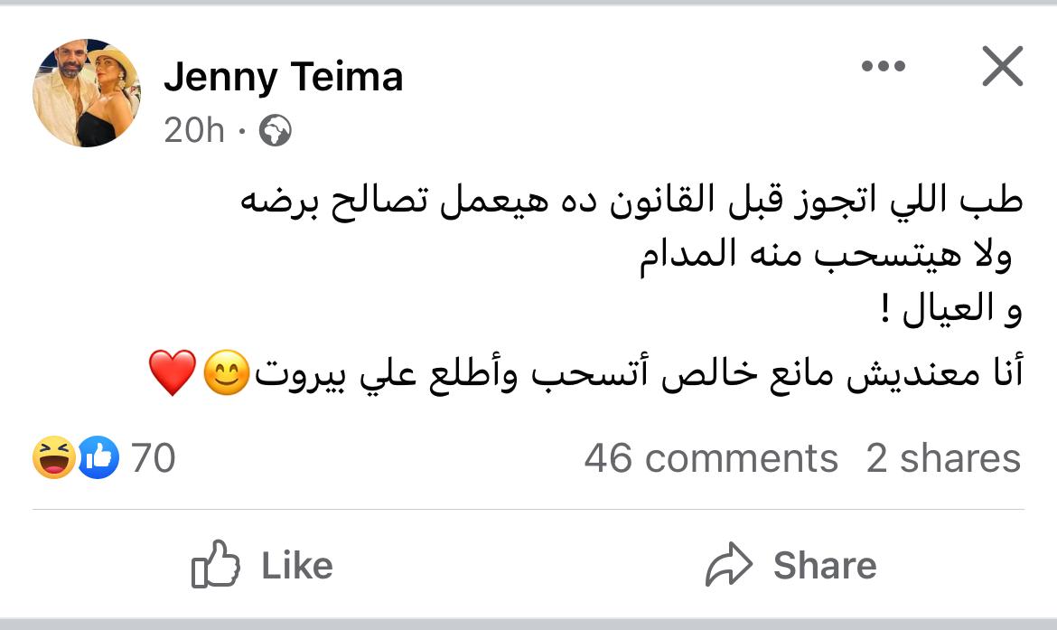 وكتبت جيني مازحة: طب اللي اتجوز قبل القانون ده هيعمل تصالح برضه ولا هيتسحب منه المدام و العيال!.
