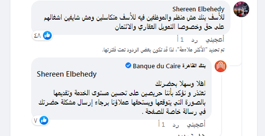 من جانبه، قالت أحدى عملاء بنك القاهرة في تعليق على صفحة المصرف الرسمية على موقع "فيسبوك"،: "للأسف بنك مش منظم والموظفين فيه للأسف متكاسلين ومش شايفين اشغالهم على حق وخصوصا التمويل العقاري والائتمان".