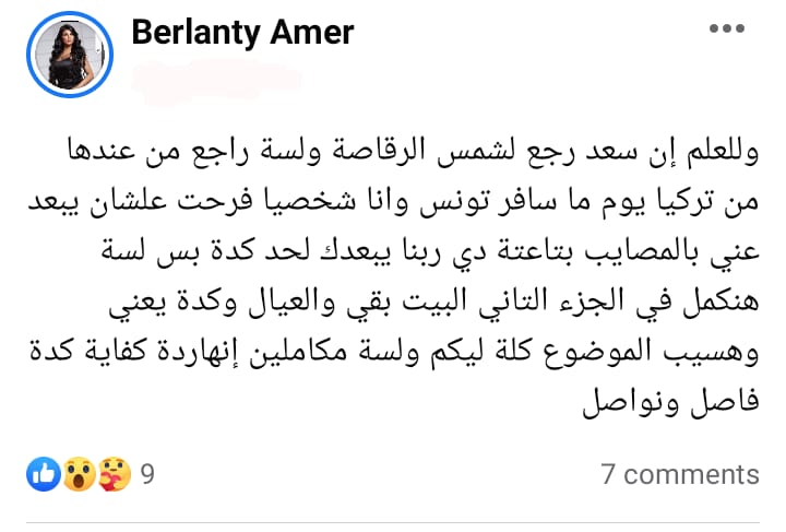 كتبت برلنتي عامر عبر صفحتها الرسمية بموقع التواصل الإجتماعي “فيسبوك”: “ سعد رجع لشمس الرقاصة ولسة راجع من عندها من تركيا يوم ما سافر تونس وانا شخصيا فرحت علشان يبعد عني بالمصايب بتاعته دي، نا يبعدك لحد كدة بس لسة هنكمل في الجزء التاني البيت بقي والعيال وكدة يعني وهسيب الموضوع كلة ليكم ولسة مكاملين إنهاردة كفاية كدة فاصل ونواصل”.