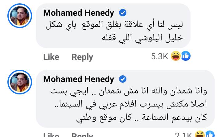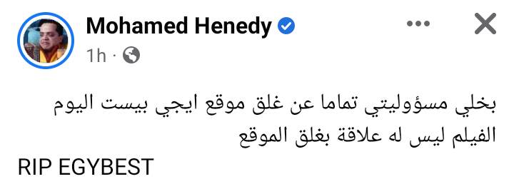 وكتب محمد هنيدي عبر حسابه الرسمي بموقع التواصل الإجتماعي “فيسبوك”: بخلي مسؤوليتي تماما عن غلق موقع ايجي بيست اليوم.. الفيلم ليس له علاقة بغلق الموقع.