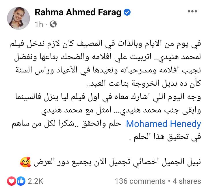 وتابعت: وجه اليوم اللي اشارك معاه في اول فيلم ليا ينزل فالسينما وابقى جنب محمد هنيدي... امثل مع محمد هنيدي حلم واتحقق ..شكرا لكل من ساهم في تحقيق هذا الحلم.