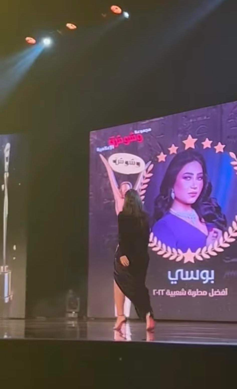 حرصت الفنانة بوسي على توجيه الشكر لمدير أعمالها والجمهور وذلك خلال تكريمها كأفضل مطربة شعبية لعام 2022 في وشوشة المقام الآن في مركز المنارة للمؤتمرات بالتجمع الخامس.