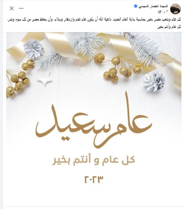 وكتبت السيدة انتصار السيسي عبر صفحتها على فيس بوك: “كل عام وشعب مصر بخير بمناسبة بداية العام الجديد، داعية الله أن يكون عام تقدم وازدهار وسلام، وأن يحفظ مصر من كل سوء وشر”.