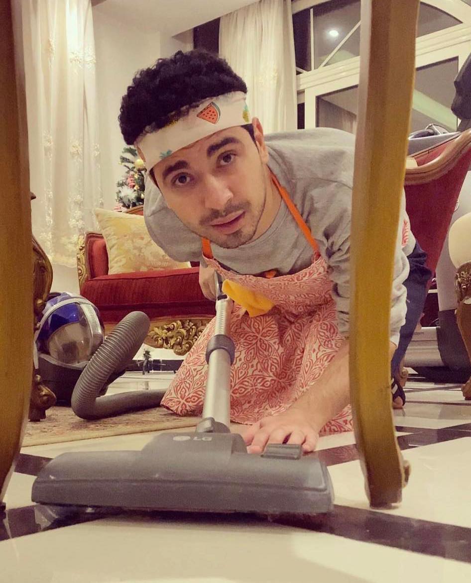 وظهر محمد أنور بالملابس الخاصة بمدبرات المنزل، ومعه مكنسة كهربائية، وعلق: لما تحب تبدأ السنة الجديدة على نضافة.
