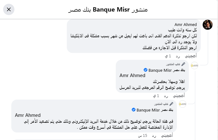 رد موظف خدمة عملاء بنك مصر على الشكوى قائلاً: "في هذه الحالة يرجي توضيح ذلك من خلال خدمة البريد الإليكتروني وذلك حتي يتم تصعيد الأمر إلي الإدارة المختصة للعمل علي حل المشكلة في أسرع وقت ممكن".