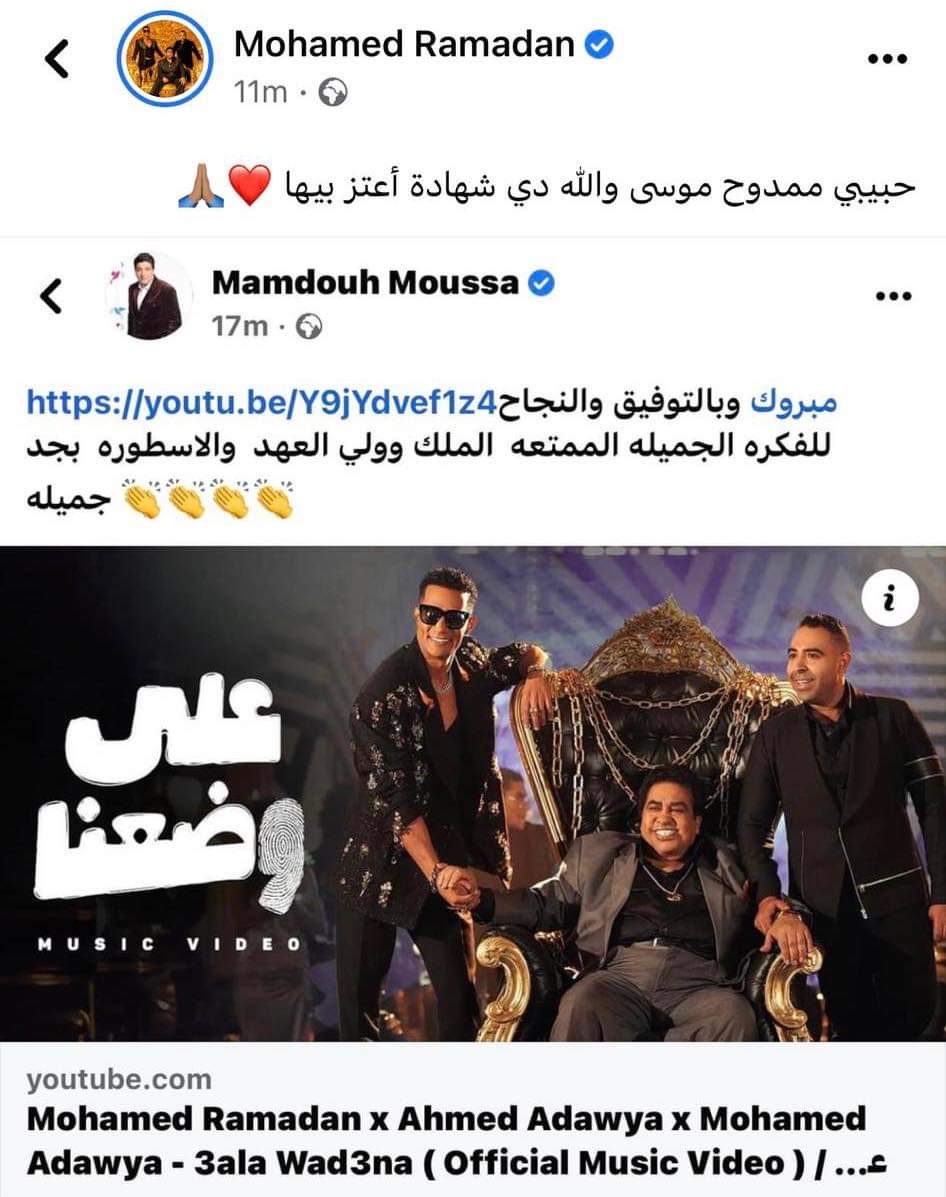 أشاد الإعلامي ممدوح موسى بأغنية على وضعنا التي طرحها محمد رمضان مع أول ساعات العام الجديد، بالتعاون مع أحمد عدوية ونجله محمد.