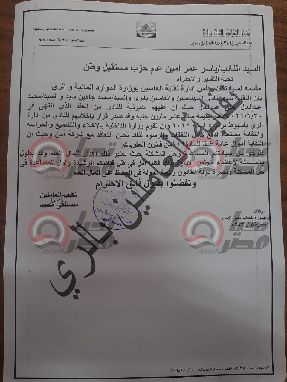 وإنذرت النقابة المعتدين على أملاكها عشرات الإنذارات، عن طريق المحكمة ووزارة الموارد المائية والري الإدارة العامة لري أسيوط، بناءً على رغبة رئيس مجلس إدارة النقابة مصطفى محمد مصطفى أحمد، لإخلاء العين وتسليمها إلى الجهة الإدارية التابعة لها، طبقا للقانون 147لسنة 2021 الصادر من الإدارة القانونية للموارد المائية والري.