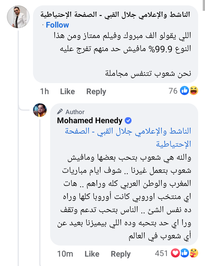 من جانبه رد عليها محمد هنيدي، قائلا: والله هي شعوب بتحب بعضها ومافيش شعوب بتعمل غيرنا .. شوف ايام مباريات المغرب والوطن العربي كله وراهم .. هات اي منتخب اوروبي كانت أوروبا كلها وراه ده نفس الشئ .. الناس بتحب تدعم وتقف ورا اي حد بتحبه وده اللي بيميزنا بعيد عن أي شعوب في العالم.