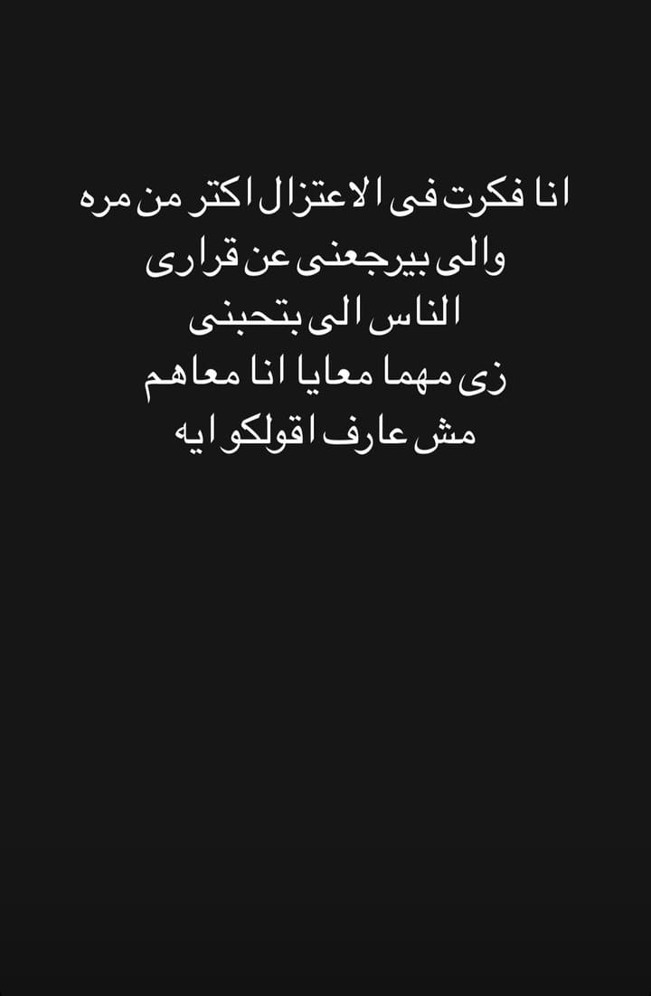 كتب عنبة عبر حسابه الرسمي بموقع تبادل الصور والفيديوهات انستجرام، من خلال خاصية “ستوري”: أنا فكرت في الإعتزال أكتر من مرة، واللي بيرجعني عن القرار الناس اللي بتحبني.. وزي مهما معايا أنا معاهم مش عارف أقولكم ايه.