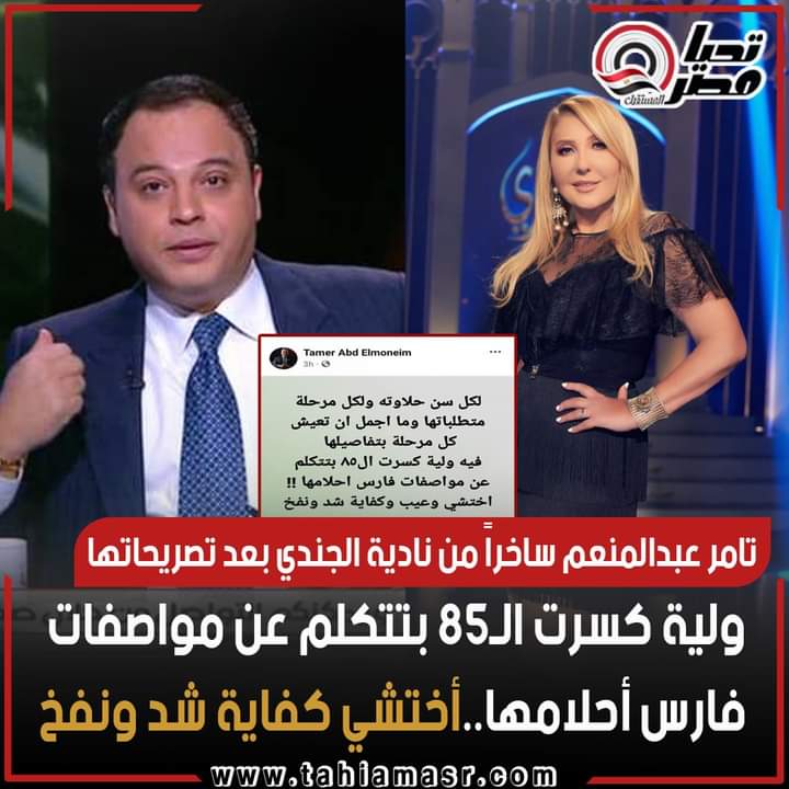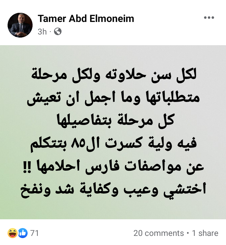 كتب تامر عبد المنعم عبر حسابه الرسمي بموقع التواصل الاجتماعي فيسبوك: لكل سن حلاوته ولكل مرحلة متطلباتها وما أجمل إن تعيش كل مرحلة بتفاصيلها.. فيه ولية كسرت ال٨٥ بتتكلم عن مواصفات فارس احلامها! اختشي وعيب وكفاية شد ونفخ