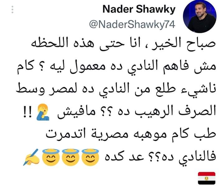 ونشر نادر شوقي، رسالة غامضة عبر حسابه الشخصي بموقع التواصل الاجتماعي “ تويتر”، وكتب: “ صباح الخير ، أنا حتى هذه اللحظة مش فاهم النادي ده معمول ليه، كام ناشئ طلع لمصر بعد كم الصرف الرهيب ده!؟ مافيش، طب كام موهبة اتدمرت في النادي ده!؟ عد كده”.
