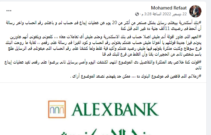 مواطن يشكو: "بنك الاسكندرية بيبعتلى رسائل بإيداعات وأنا معنديش حساب"