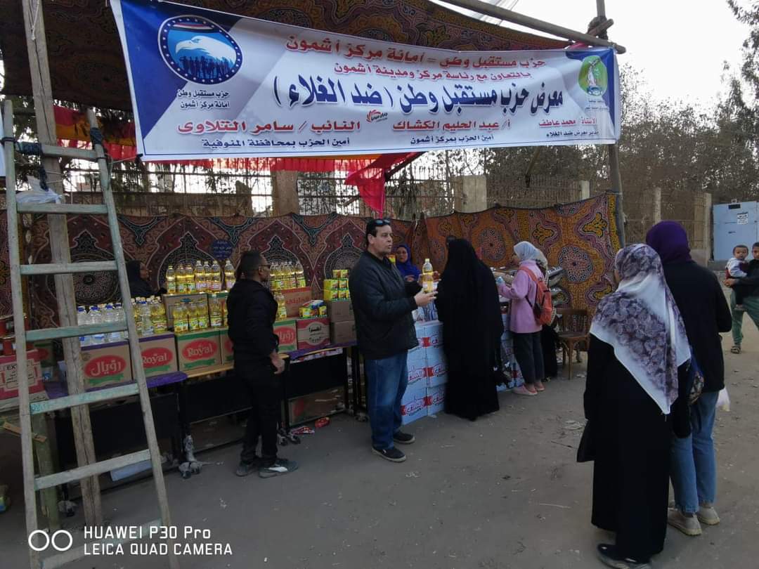 وفي محافظة المنوفية، تواصل أمانة مركز أشمون، إقامة سلسلة معارض ومنافذ "ضد الغلاء"، لبيع السع الغذائية الجافة والتموينية، بأسعار مخفضة، في قرية رملة الأنجب، وشمل المنفذ جميع السلع والمنتجات الغذائية والتي تلزم كل بيت من سكر وأرز ومكرونة وزيوت وسمن ودقيق وجبن ومعلبات ومنظفات وجميع أنواع الورقيات، وشهد المنفذ إقبالا كثيفا من المواطنين منذ بداية المنفذ.